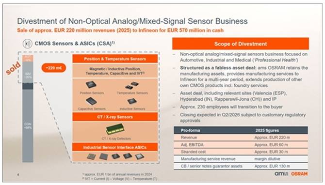 以 5.7 亿欧元现金向英飞凌出售其非光学类类比/混合讯号车用、工业及医疗传感器业务;该交易预计于 2026 年第二季完成。
