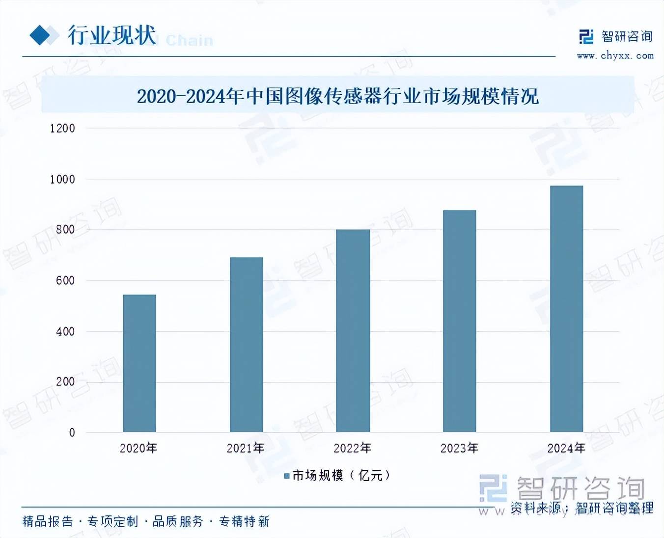 图像传感器是利用光电器件的光电转换功能将感光面上的光像转换为与光像成相应比例关系的电信号。2024年,中国图像传感器行业市场规模约为972.24亿元,同比增长10.71%。视觉检测系统接收图像传感器传来的原始数据,对信息提取与理解,通过算法(如图像处理、机器学习)对数据进行计算、分析,最终做出判断。随着消费电子、汽车电子、安防监控及工业医疗等多领域需求的集中爆发,图像传感器性能不断提高,视觉检测系统得以实现更高的检测速度、分析更复杂的3D场景等。